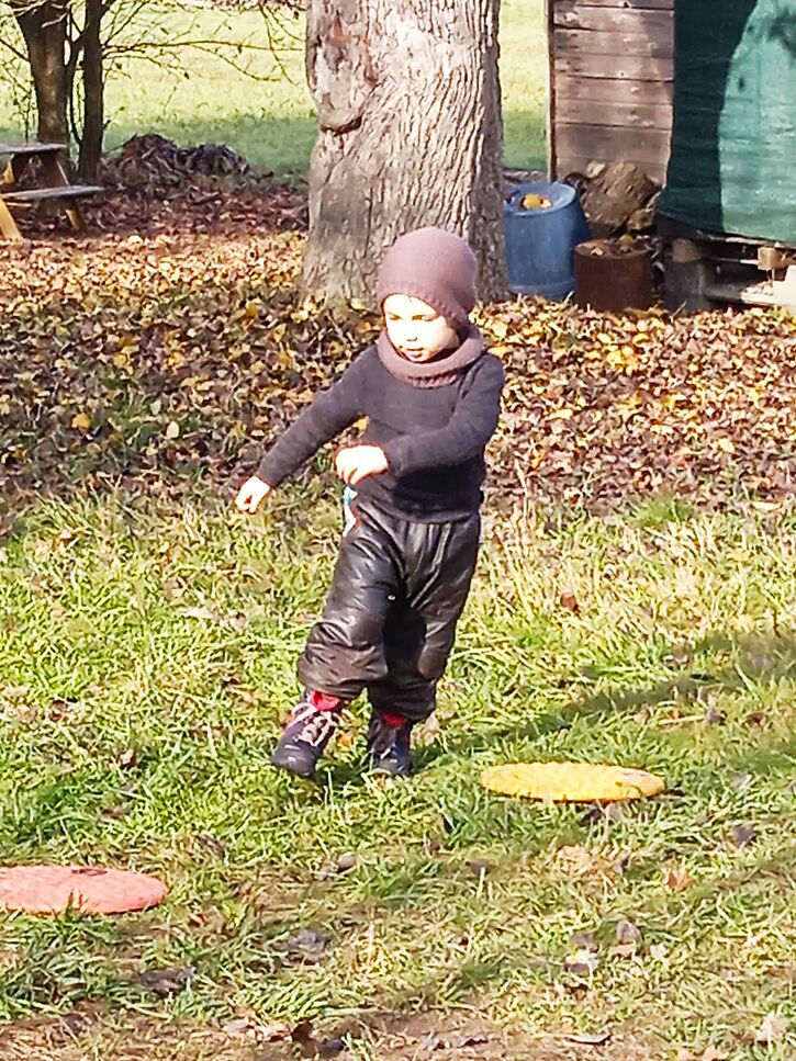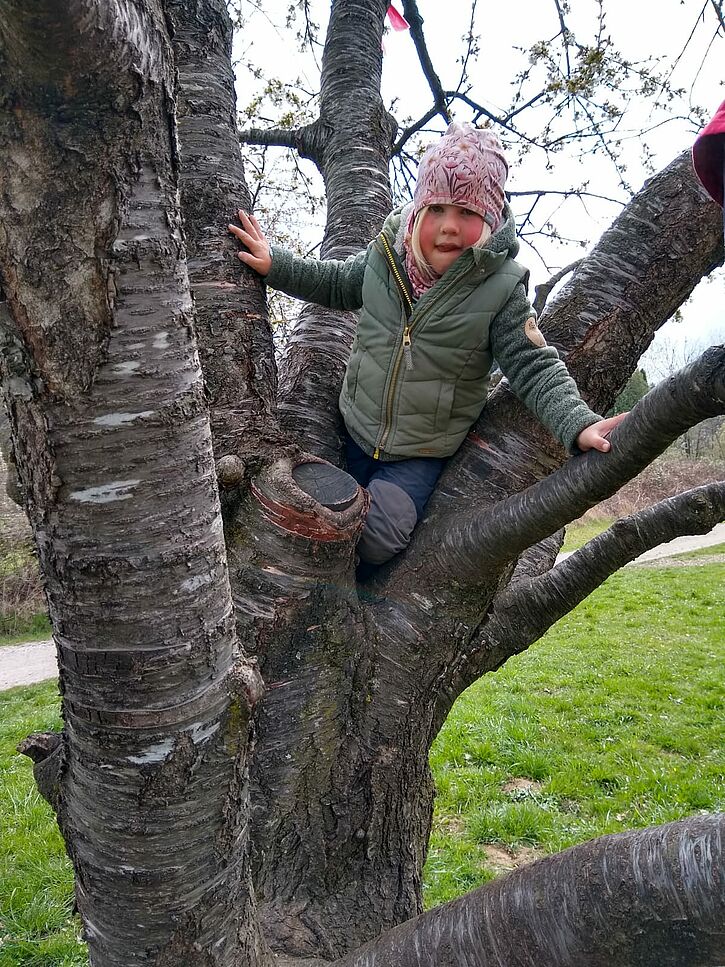 Der großzügige Raum, den uns die Natur bietet, lädt zum Ball- und Fangen spielen, Stelzen laufen, auf Bäume klettern ein, aber auch Rückzug ist möglich.